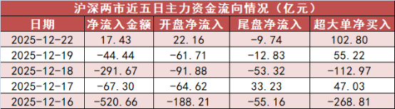 12月22日,A股市场整体上涨。 截至收盘,上证指数收报3917.36点,上涨0.69%,深证成指收报13332.73点,上涨1.47%,创业板指收 报3191.98点,上涨2.23%,北证50指数上涨0.24%。A股市场合计成交18824.11亿元,较上一交易日增加 1334.73亿元。 1.A股市场全天主力资金净流入17.43亿元 今日A股市场主力资金开盘净流入22.16亿元,尾盘净流出9.74亿元,全天净流入17.43亿元。 | | | 沪深两市近五日主力资金流向情况(亿元) | | | | --- | --- | --- | --- | --- | | 日期 | | | 净流入金额 开盘净流入 尾盘净流入 超大单净买入 | | | 2025-12-22 | 17. 43 | 22. 16 | -9.74 | 102. 80 | | 2025-12-19 | -44 44 | -61.71 | -12.83 | 55. 22 | | 2025-12-18 | -291.67 | -91.88 | -53. 32 | -112.97 | | 2025-12-17 | -67.30 | -64.62 | 3 ...