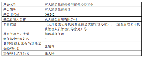张大铮离任英大通盈纯债债券英大安惠纯债