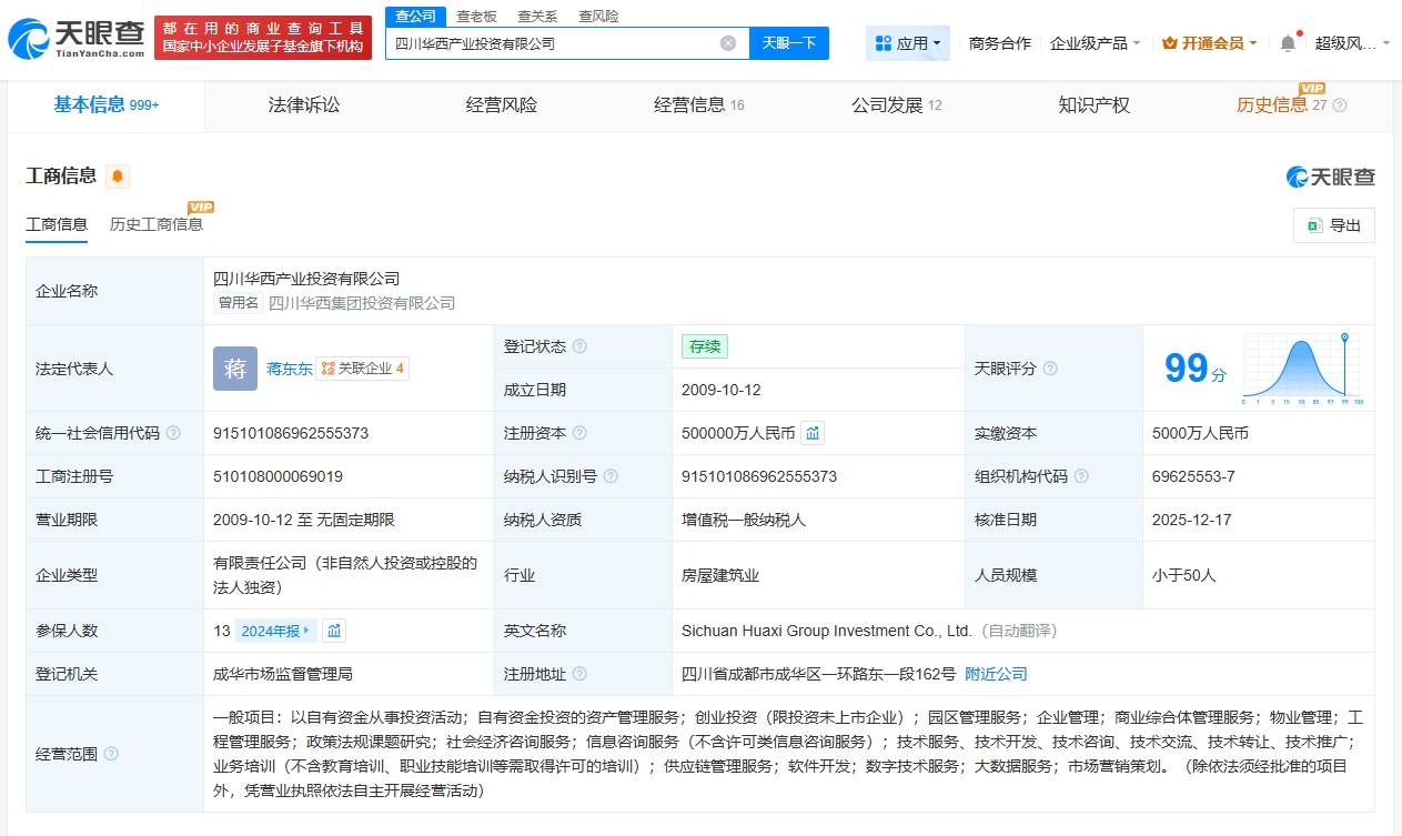 天眼查工商信息显示,近日,四川华西集团投资有限公司发生工商变更,企业名称变更为四川华西产业投资有限公司,注册资本由5000万人民币增至50亿人 民币,增幅9900%。 该公司成立于2009年10月,法定代表人为蒋东东,经营范围包括以自有资金从事投资活动、自有资金投资的资产管理服务、创业投资等。股东信息显示,该 公司由四川华西集团有限公司全资持股。 | | 音公司 都在用的商业查询工具 | 查老板 查关系 查风险 | | | | | | --- | --- | --- | --- | --- | --- | --- | | | 中小企业发展子基金旗下机构 | 四川华西产业投资有限公司 | නි 天眼一下 | 脂 应用 ▼ | 商务合作 企业级产品 · ■ 开通: | | | 基本信息 999+ | 法律诉讼 | 经营风险 | 经营信息 16 | 公司发展 12 | 知识产权 | | | 工商信息 @ 工商信息 历史丁商信息 | VIP | | | | | | | 企业名称 | 四川华西产业投资有限公司 曾用名 四川华西集团投资有限公司 | | | | | | | 法定代表人 | 落 落东东 【关联企业 4 | ...