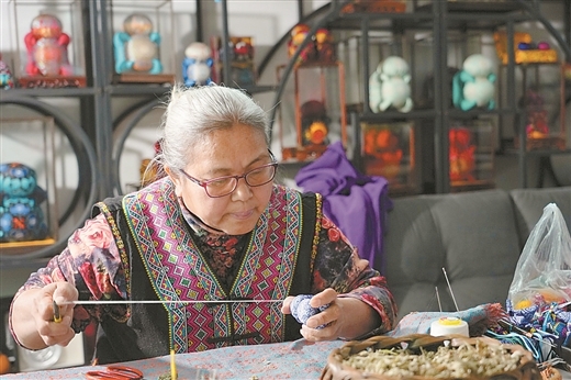 12月26日,冬日的右江清波微漾,澄澈天光映水,漾起淡蓝的涟漪。走进百色老乡家园麽乜作坊, 一缕草木辛香扑面而来,与窗外清寒撞个满怀。一旁的竹筐里,深绿艾草叶蜷着身子;案台上,裹着五 彩壮锦的麽乜,顶着圆润脑袋,或列队成行,或缀于各式文创,憨拙模样里透着灵动的喜气。 90后李樱符俯首案前,指尖拈着银针,在斑斓壮锦布上轻巧游走;身旁,母亲唐纯翠正将晒干的艾 草,稳稳塞入布坯,力道沉实,仿佛把所有祈愿,压实凝入这方寸吉祥物里。同为右江区级非物质文化 遗产代表性传承人,母女俩用针线与药草,共同守护着这门源自端午时节的民间绝活——右江壮族麽乜 制作技艺。 麽乜由身、头、龙珠三部分缝合而成。"合格的麽乜,不可见一线一针。"唐纯翠说,固定龙珠时, 针须从预定线口"点对点"刺入,在肢体与珠体间穿行,形成一道隐形的三角拉力。稍有偏移,珠体歪 斜,神韵全失。 最见功夫的,是缝合"人抱龙珠"这精妙环节。唐纯翠敛声屏气,针线如灵蛇,从龙珠内巧妙穿出, 轻轻钻入麽乜手臂,再自指尖悄然探出,最终隐匿回珠心。如此在四肢往复穿梭,线迹在内部织就一个 无形的"中国结",把各个部件紧密相连,表面光洁如玉,宛若天成。 "麽乜",壮语音译,意为" ...