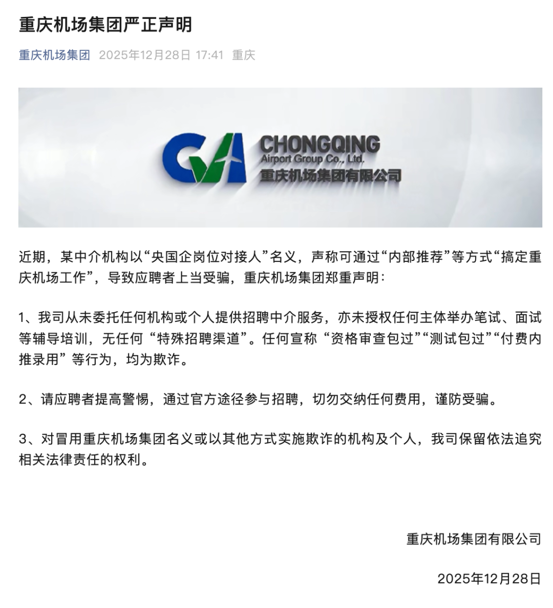 12月28日,重庆机场集团发布声明: 近期,某中介机构以"央国企岗位对接人"名义,声称可通过"内部推荐"等方式"搞定重庆机场工作",导致应聘者上当受骗,重庆机场集团郑重声明: 1、我司从未委托任何机构或个人提供招聘中介服务,亦未授权任何主体举办笔试、面试等辅导培训,无任何 "特殊招聘渠道"。任何宣称 "资格审查包 过""测试包过""付费内推录用" 等行为,均为欺诈。 2、请应聘者提高警惕,通过官方途径参与招聘,切勿交纳任何费用,谨防受骗。 3、对冒用重庆机场集团名义或以其他方式实施欺诈的机构及个人,我司保留依法追究相关法律责任的权利。 ...