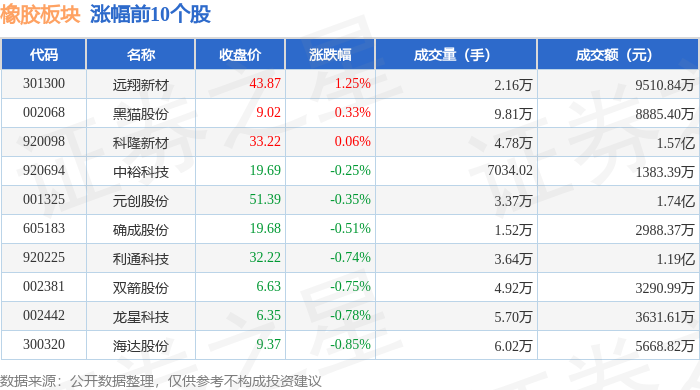 橡胶板块市场表现 - 2023年12月26日,橡胶板块整体表现疲软,较上一交易日下跌2.46% [1] - 当日上证指数上涨0.1%至3963.68点,深证成指上涨0.54%至13603.89点,橡胶板块表现显著弱于大盘 [1] - 板块内个股普跌,领跌股为天铁科技,其股价单日大幅下跌13.43% [1][2] 板块个股涨跌情况 - 在列出的20只个股中,仅3只上涨,17只下跌,显示板块整体承压 [1][2] - 涨幅居前的个股为远翔新材(上涨1.25%)、黑猫股份(上涨0.33%)和科隆新材(上涨0.06%) [1] - 跌幅居前的个股除天铁科技外,还包括彤程新材(下跌3.21%)、科强股份(下跌2.31%)和阳谷华泰(下跌2.22%) [2] 板块资金流向 - 当日橡胶板块整体呈现主力资金净流出状态,净流出金额为2.82亿元 [2] - 游资与散户资金则呈现净流入,金额分别为9479.38万元和1.87亿元 [2] - 在具体个股中,远翔新材获得主力资金净流入724.19万元,净占比为7.61%,表现相对强势 [3] - 天铁科技在股价大跌的同时,其主力资金流向数据未在提供的表格中明确显示,但板块整体主力资金流出表明其可能面临较大的抛压 [1][2] 重点公司交易情况 - 天铁科技成交量异常放大,达119.37万手,成交额为7.37亿元,股价大跌伴随高成交,显示市场关注度极高且抛售压力巨大 [2] - 科创新材成交额居前,达10.02亿元,但股价下跌1.75% [2] - 彤程新材成交额也较高,为9.26亿元,股价下跌3.21% [2] - 部分公司如龙星科技、海达股份虽股价下跌,但仍获得主力资金小幅净流入 [3]