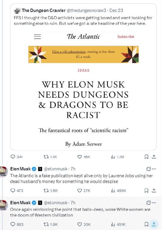 特斯拉CEO埃隆·马斯克周二在社交平台X上回应了《大西洋月刊》的一篇文章,该文章称他是"科学种 族主义者",并将矛头指向资助该刊物的已故苹果联合创始人史蒂夫·乔布斯的遗孀劳伦·乔布斯,顺便再 次批评了亚马逊创始人杰夫·贝索斯前妻麦肯齐·斯科特的慈善捐赠。 一位X用户分享了《大西洋月刊》11月份的文章《为什么埃隆·马斯克需要龙与地下城来成为种族主义者 ——"科学种族主义"的虚幻根源》。 马斯克回应称:"《大西洋月刊》是一份假刊物,靠着劳伦·乔布斯用她亡夫的钱做一些他会鄙视的事情 才得以存活。" 他补充称:"这再次强调了一点,即'觉醒'白人女性是西方文明的厄运。" 一位网友评论称:"亿万富翁的左翼妻子是西方文明最大的威胁之一。她们精神不稳定,拥有世界上所 有的钱来制造混乱。" 马斯克回应称:"是的!麦肯齐·贝索斯(或者不管她现在姓什么)是另一个例子。她鄙视她的前任,并 希望任何像他这样的人去死。" 马斯克的这条帖子还附带了2024年一篇文章的链接,该文章讲述了贝索斯的前妻如何将大部分慈善捐赠 给了"帮助移民罪犯和变性运动员的极左组织。" 一位网友评论称:"亿万富翁的左翼妻子是西方文明最大的威胁之一。她们精神不稳定 ...