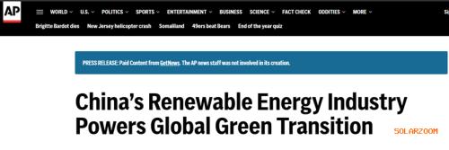 报道还提到,近年来,随着风能和光伏的快速增长,中国的清洁能源利用率保持在95%以上,这些发电 资源主要集中在北方、西北和东北地区,而负荷中心位于东部和南部沿海地区;通过持续的大容量特高 压线路建设,中国大幅提升了跨省区和区域间的新能源输电能力,有效解决了资源与负荷的地理匹配问 题。 中通证券则指出,以新能源汽车、锂离子电池、光伏和风电为代表的中国清洁产业链通过持续技术创新 和充分市场竞争,不断降低成本、提高效率,为全球绿色转型提供坚实的产品和服务支撑。 日前,我国西气东输主力气源地——塔里木油田全年光伏发电量突破20亿度,单日最高发电量超1000万 度,创年发电量、日发电量历史新高,标志着塔克拉玛干沙漠腹地构建起油、气、新能源协同发展新格 局。 美联社此前发文称,中国的光伏和风电产业取得了显著进步。2024年,中国可再生能源发电达到3500太 瓦时,占总发电量的35%;风电和光伏发电总量达到1800太瓦时,占总发电量的19%。 ...