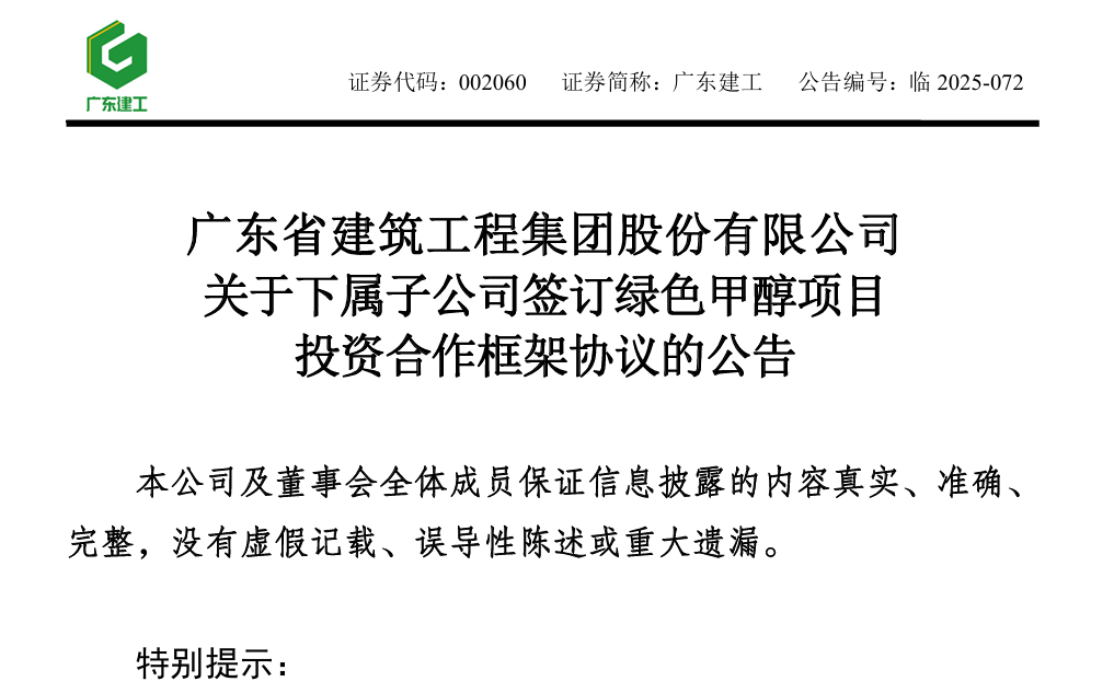广东建工近日公告披露,公司旗下广东水电二局集团有限公司的全资子公司广东粤水电能源投资集团有限公司(下称"粤水电能源 集团")与临沂市郯城县政府在临沂市签署《绿色甲醇项目投资合作框架协议》,拟在临沂市郯城县投资建设绿色甲醇、绿色LNG 及集中式风电项目。 文 | 经济导报 初磊 在"双碳"目标驱动绿色能源转型背景下,广东省属基建龙头广东建工(002060.SZ)通过旗下能源投资平台加速布局山东市场。 这是粤水电能源集团继去年落子济南、菏泽曹县后,在山东绿色能源领域的又一重大投资,也标志着广东建工通过旗下公司加快 向"基建+清洁能源综合服务商"转型。 延链补链强链 预估总投资约60亿元 广东建工公告披露,粤水电能源集团拟规划建设年产20万吨绿色甲醇、6.5万吨绿色LNG项目,并配套建设500MW集中式风电项 目,预估总投资约60亿元。 在这次合作中,郯城县政府发挥自身丰富的行政管理经验及当地资源优势,粤水电能源集团发挥清洁能源开发经验、投资能力及运 营管理等方面优势,双方共同谋划开发绿色甲醇。 转自:山东财经报道 粤水电能源集团成立于2023年1月,注册资本10亿元,法定代表人王桂生,是广东建工所属的能源投资公司 ...