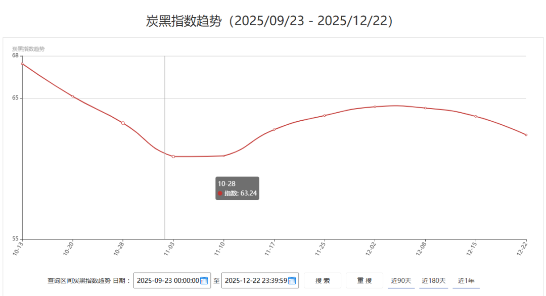 (来源:炭黑产业网) (近90日炭黑指数趋势▲) (近180日炭黑指数趋势▲) (近1年炭黑指数趋势▲) 炭黑指数简介:炭黑产业网炭黑指数是以国标通用炭黑N330、N220、N550等产品报价大数据为基础,分别采集了一、二、三线品牌不同地区的报价进行 综合分析,并根据市场产品交易量进行权重分配而得到的最终数据。数据结果由算法自动生成,每周一17:00进行一次指数更新(节假日不更新)。 (来源:炭黑产业网) (近90日炭黑指数趋势▲) (近180日炭黑指数趋势▲) (近1年炭黑指数趋势▲) 炭黑指数简介:炭黑产业网炭黑指数是以国标通用炭黑N330、N220、N550等产品报价大数据为基础,分别采集了一、二、三线品牌不同地区的报价进行 综合分析,并根据市场产品交易量进行权重分配而得到的最终数据。数据结果由算法自动生成,每周一17:00进行一次指数更新(节假日不更新)。 ...