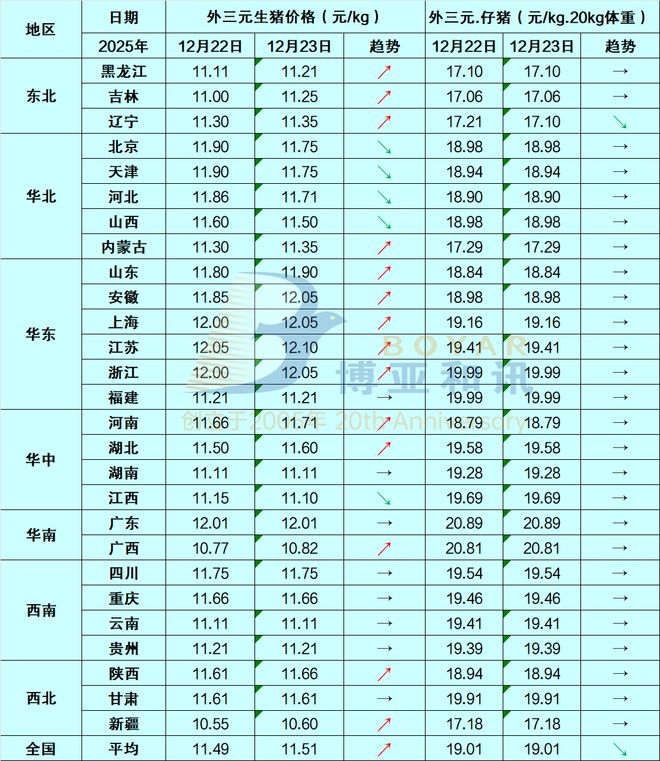 来源:市场资讯 (来源:博亚和讯) | 座区 | 日前 | | 外三元生猪价格(元/kg) | | | 外三元.仔猪(元/kg.20kg体重) | | | --- | --- | --- | --- | --- | --- | --- | --- | | | 2025年 | 12月22日 | 12月23日 | 趋势 | 12月22日 | 12月23日 | 趋势 | | | 黑龙江 | 11.11 | 11.21 | 7 | 17.10 | 17.10 | -> | | 东北 | 吉林 | 11.00 | 11.25 | 7 | 17.06 | 17.06 | - | | | 辽宁 | 11.30 | 11.35 | 1 | 17.21 | 17.10 | 7 | | | 北京 | 11.90 | 11.75 | 7 | 18.98 | 18.98 | -> | | | 天津 | 11.90 | 11.75 | 7 | 18.94 | 18.94 | → | | स्रूनी | 河北 | 11.86 | 11.71 | 7 | 18.90 | 18.90 | → | | | 山西 | 11.60 | 11.5 ...