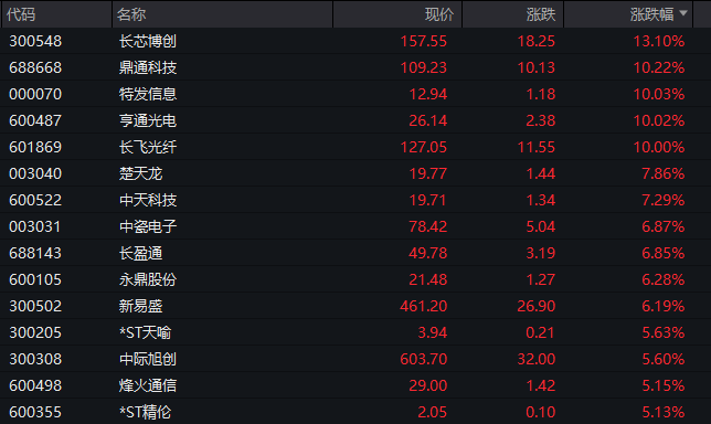 A股市场今天(12月22日)上午整体走强,上证指数重返3900点整数关口以上。 A股市场热点方面,通信板块、海南自贸区概念板块均掀起涨停潮,成为上午市场两大主线亮点。 港股中原建业复牌 盘中大涨逾60% 沪指重回3900点 A股两大板块掀起涨停潮 A股市场今天(12月22日)上午整体走强,主要指数不同程度上行,其中上证指数重返3900点整数关口 以上。 行业板块和赛道方面,若按照申万一级行业划分,通信板块涨幅居前,板块盘中涨幅一度超过4%。板 块内个股掀起涨停潮,长芯博创(300548)、鼎通科技盘中涨幅超过10%,特发信息(000070)、亨通 光电(600487)、长飞光纤(601869)、楚天龙(003040)等多股盘中涨停。 | 代码 | 名称 | 现价 | 涨跌 | 涨跌幅 | | --- | --- | --- | --- | --- | | 300548 | 长芯博创 | 157.55 | 18.25 | 13.10% | | 688668 | 鼎通科技 | 109.23 | 10.13 | 10.22% | | 000070 | 特发信息 | 12.94 | 1.18 | 10.03% | | ...