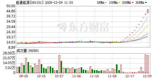 胜通能源盘中涨停,已连收10个涨停板,截至9:25,该股报38.27元,换手率0.52%,成交量103.48万 股,成交金额3960.31万元,涨停板封单金额为5.35亿元。连续涨停期间,该股累计上涨159.46%,累计 换手率为8.74%。最新A股总市值达108.01亿元,A股流通市值75.44亿元。 龙虎榜数据显示,该股因连续三个交易日内,涨幅偏离值累计达20%上榜龙虎榜4次,买卖居前营业部 中,机构净卖出483.00万元,营业部席位合计净买入1.12亿元。 据天眼查APP显示,胜通能源股份有限公司成立于2012年11月13日,注册资本28224万人民币。(数据 宝) 近日该股表现 | 日期 | 当日涨跌幅(%) | 换手率(%) | 主力资金净流入(万元) | | --- | --- | --- | --- | | 2025.12.24 | 9.99 | 4.17 | 8565.25 | | 2025.12.23 | 10.02 | 1.37 | 3382.57 | | 2025.12.22 | 9.98 | 0.29 | 1170.25 | | 2025.12.19 | 10.02 | 0.56 | ...