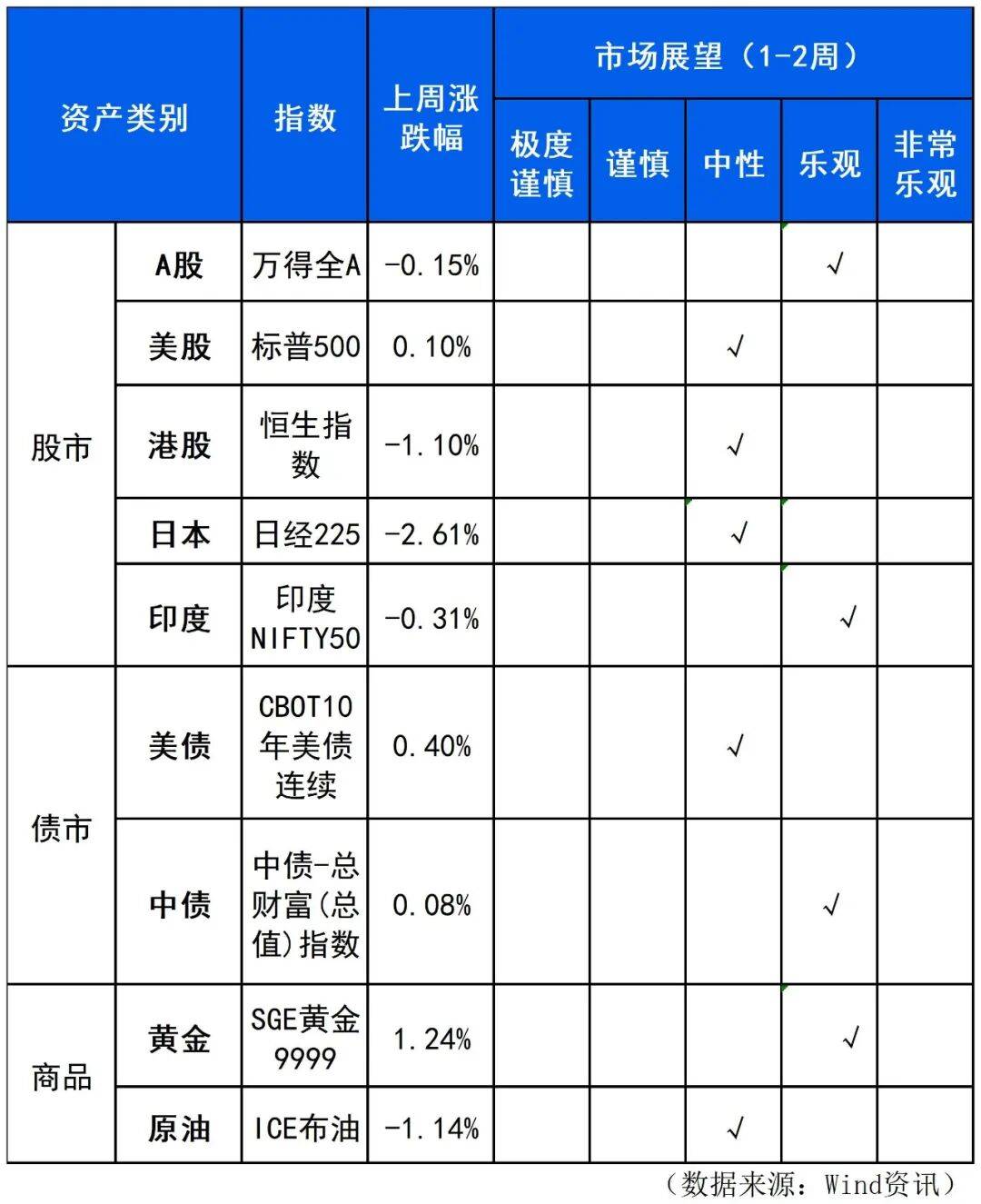 大类资产核心观点总览 - 中期内美债利率下行方向相对较为确定 具备相对较高的票息价值 但中期内美债市场供需格局或仍偏脆弱 后续有一定债券供给压力 [1] - 港股短期盈利预期稳定 但南向季节性因素支撑有限 海外流动性是主要驱动因素 海外不确定性尚存同时AI质疑仍在持续 市场可能延续震荡偏弱的状态 [1] - 黄金在盘整一个月后已消化较多利空 叠加长期逻辑清晰 整体维持乐观观点 [1] 股市资产观点 美股 - 上周标普500指数上涨0.10% 纳斯达克指数上涨0.48% 道琼斯指数下跌0.67% [2][4] - 驱动因素:分子端 10月核心零售超预期 11月CPI读数存在下行偏差 11月非农新增小幅超预期但失业率与薪资同步走弱 经济动能放缓趋势尚未扭转 分母端 11月CPI大幅走弱增加2026年全年降息预期 截至12月19日OIS市场预期2026年美联储全年降息空间由55BP升至61BP [3][4] - 短期展望:标普500重回20日均线上方 隐含波动率趋于下降 “圣诞老人”行情或支撑美股 美国就业放缓趋势未变 Fed Put依然成立 市场降息预期已转向“降息动因与幅度” 2026年仍有两次降息 叠加日本央行鸽派加息 全球流动性担忧有缓解 本周美股进入圣诞季 交投转向清淡 Santa rally效应(年末最后5个交易日及年初2个交易日美股正收益概率高)对美股或有支撑 [4] - 中期展望:四季度美联储开启技术性缩表 叠加SLR监管放松以及降息周期尚未终结 流动性环境仍相对宽松 美国经济较衰退仍有距离 标普500 Q4盈利同比增长预期在10.8% 盈利增长持续消化高估值 美股阶段性机会仍在 [4] - 综合给予美股中性观点 [5] A股 - 上周万得全A指数下跌0.15% [2] - 市场回顾:上周指数前两个交易日连续大幅回调 一度触及3816一线 周三起强势反弹 全周走势探底回升 图形上 3816一线的强支撑位再次被验证 近期市场投交热情有所回升 近10日日均成交额回到1.8万亿水平 从中期视角来看 指数的上升趋势并未改变 [16] - 市场展望:上周海外市场影响较大 美股AI产业方向先回撤后反弹 日央行加息正式落地 可预期后续全球市场流动性担忧将减缓 同时在A股市场可以观察到监管对于重要点位的护盘决心 展望下周 在全球流动性担忧减缓 AI产业利好等因素的驱动下 市场有望继续上行 基本面维度 11月工业增加值增速仍保持韧性 但社零和投资为代表的内需表现一般 高层定位内需为战略之举 后续政策有望持续发力 海外方面 美国11月新增非农好于预期 通胀数据意外大幅回落 整体仍有利于权益市场走势 [16][18] 港股 - 上周恒生指数下跌1.10% 恒指、国指、恒生科技分别下跌1.51%、1.96%和2.82% [2][23] - 资金面:南向与EPFR外资净流入均边际提速 被动外资流入加快但主动外资流出亦有加快趋势 南向资金流入较前期有一定放量 周三早盘大跌之后南向支撑明显 整体看微观流动性有一定程度的改善 [22] - 海外宏观面:美国就业数据指向经济动能放缓趋势未变但1月降息的急迫性有限 美国通胀数据超预期下行但超预期部分更多来自于统计偏差和假期扰动 美联储降息路径仍取决于后续数据 日本鸽派加息未给全球市场带来过度扰动 [22] - 展望:海外宏观事件陆续落地 短期海外宏观压制或已阶段性缓解 考虑到南向在市场大跌时入场支撑信号明显 港股下行空间可控 但是一方面港股申请IPO数量仍处于高位 对流动性造成一定压力 另一方面国内政策层面未有超预期信号和财政发力有限 港股仍缺乏大幅上行的事件催化 短期市场或更多演绎海外映射逻辑 [23] 日本股市 - 上周日经225指数下跌2.61% [2] - 市场表现:上周日股受困于宏观政策周期的剧烈冲突 呈现偏弱震荡走势 日银(BOJ)正式落地加息决策 宣告国内货币环境实质性转紧 美联储处于明确的降息周期中 这种“美松日紧”的极致宏观剪刀差 迅速压缩了日美利差空间 导致日元汇率中枢显著上移 进而引发了针对日元资产的估值重构 年末全球市场流动性逐步收紧 增量资金缺乏入场意愿 [12] - 中期展望:日本央行的加息与缩减购债节奏相对温和 可在维持市场稳定的同时推动利率正常化 基本面上 薪资增速持续提升 有望带动内需复苏 而输入型通胀回落将缓解企业与居民压力 制造业虽受海外需求扰动 但结构性产业升级提供新动能 配合全球进入降息周期 日元套息交易调整或反而吸引长期资金流入 [12] - 长期展望:特朗普上台后 日本在地缘格局中的战略地位显著上升 去中国化背景下其在半导体、军工等产业链的全球订单持续扩张 叠加日元贬值对出口竞争力的支撑 将进一步强化外需拉动与资本流入 [13] - 综合对日本股市持中性观点 [14] 印度股市 - 上周印度NIFTY50指数下跌0.31% [2] - 市场表现:上周印度股市呈现缩量震荡态势 市场缺乏明确方向 受临近圣诞及年末长假影响 外资交易活跃度显著降低 市场开启假日模式 成交量的萎缩直接削弱了指数波动率 主要以存量资金的结构性轮动为主 上周处于政策与数据的真空期 此前“外松内紧”的宏观叙事已被充分计价 投资者的关注焦点已转移至即将到来的Q3财报季及2月联邦预算案Union Budget的政策风向上 [8] - 长期展望:地缘政治层面上 印度是美西方“去中国化”的直接受益者 其战略模糊与多边对冲策略使其能够左右逢源 既可在俄罗斯和沙特博弈中获得廉价能源 又能在中美对抗中承接产能转移 获取低成本商品和产业技术 同时借助印太战略框架获得美日等国的