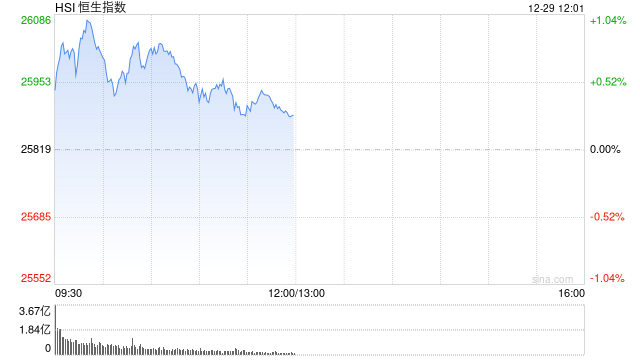 12月29日消息,港股三大指数集体上涨。截至午间收盘,恒生指数涨0.26%,报25886.75点,恒生科技 指数涨1.60%,国企指数涨0.77%。盘面上,科网股普涨,网易、美团涨超2%,百度、联想、快手、哔 哩哔哩涨超1%;汽车股走强,蔚来涨超6%;脑机接口概念普涨,心玮医疗涨超10%;纸业股涨幅居 前,玖龙纸业涨超4%。 | 名称 | | 最新价 | 涨跌幅 √ | | --- | --- | --- | --- | | 但生科技指数 | NY | 5587.24 | +1.60% | | 800700 | | | | | 国企指数 | ี | 8983.59 | +0.77% | | 800100 | | | | | 恒生指数 | 200 | 25886.75 | +0.26% | | 800000 | | | | 汽车股走强,蔚来涨超6%。方正证券发布研报称,中央经济工作会议及财政部明确优化"两新"政策, 多地遴选以旧换新平台企业。据媒体披露,2026年国补将延续,单车最高补3万元,聚焦淘汰老旧高排 放车辆,同时提升新能源补贴与混动车型纯电续航门槛。 脑机接口概念普涨,心玮医疗涨超10%。光大证券发布 ...