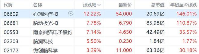 | 代码 | 名称 | | 涨跌幅 √ | 最新价 | 总市值 | 年初至今涨跌 | | --- | --- | --- | --- | --- | --- | --- | | 06609 | 心玮医疗-B | 0 | 12.22% | 54.000 | 20.69亿 | 146.01% | | 06681 | 脑动极光-B | | 7.78% | 6.790 | 85.98亿 | 110.87% | | 00553 | 南京熊猫电子股份 | | 7.14% | 4.650 | 42.49亿 | 35.57% | | 02203 | 脑洞科技 | | 5.50% | 0.230 | 1.84亿 | 1.77% | | 02172 | 微创脑科学 | | 3.29% | 11.000 | 63.36亿 | 30.18% | 港股市场脑机接口板块集体大涨,其中,心玮医疗-B涨超12%,脑动极光-B、南京熊猫电子股份涨超 7%,脑洞科技涨超5%,微创脑科学涨超3%。消息面上,12月28日,第五届脑科学前沿与产业大会暨 2025深圳脑机接口博览会启幕,"粤港澳大湾区脑科学与中枢神经疾病AI创新联盟"正式启动。 ...