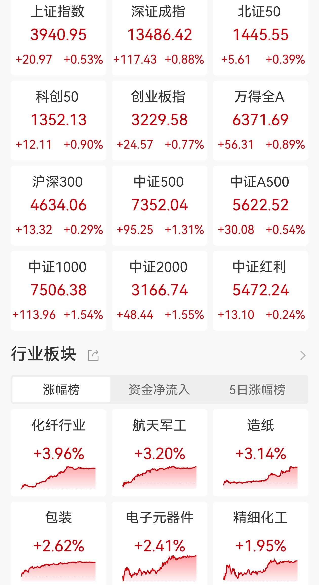 市场整体表现 - A股三大指数集体上涨 沪指涨0.53%报3940点 深证成指涨0.88% 创业板指涨0.77% [1] - 全市场成交额1.9万亿元 较前一交易日缩量241亿元 [1] - 超4100股上涨 [1] - 主要宽基指数普涨 中证1000涨1.54% 中证2000涨1.55% 中证500涨1.31% 科创50涨0.90% 万得全A涨0.89% 沪深300涨0.29% 中证红利涨0.24% [2] 领涨行业与板块 - 化纤行业涨幅居首 涨3.96% [2] - 商业航天板块爆发 近20股涨停 催化因素为蓝箭航天IPO辅导工作正式完成 [2] - 电源设备板块走高 多股涨停 [2] - 6G概念拉升 [2] - 被动元件板块走强 [2] - 卫星互联网、大飞机、碳纤维及核污染防治等板块涨幅居前 [3] 资金流向与短期强势行业 - 航天军工板块资金净流入居前 [2] - 电子元器件板块资金净流入居前 [2] - 造纸行业近5日涨幅居首 涨3.14% [2] - 精细化工行业近5日涨幅居前 涨1.95% [2] 回调行业与板块 - 乳业股下挫 庄园牧场触及跌停 [3] - 海南板块回调 海南海药、中钨高新跌逾5% [3] - 贵金属、保险及SPD概念等板块跌幅居前 [3]