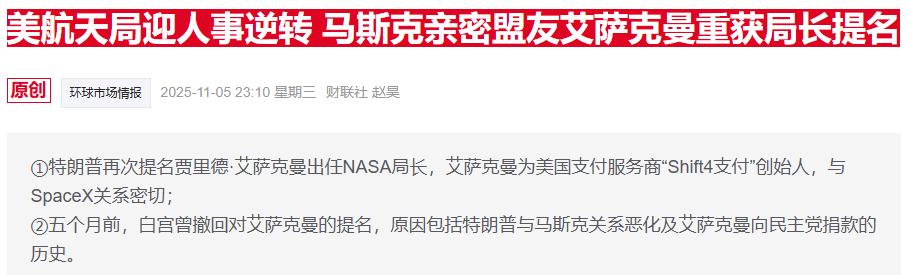 NASA新任局长贾里德·艾萨克曼表示,美国将在特朗普第二个任期内(即三年内)重返月球。 美国国家航空航天局(NASA)新任局长贾里德·艾萨克曼(Jared Isaacman)最新表示,美国将在特朗普第二个任期内(即三年 内)重返月球。 当地时间周五(12月26日),艾萨克曼在接受采访时表示,特朗普重新承诺推进月球探索,是开启"轨道经济"的关键。 艾萨克曼说道:"我们希望拥有这样的机会,去探索并释放月球在科学、经济以及国家安全层面的潜力。" 上周,美国参议院以67票赞成、30票反对的投票结果确认了艾萨克曼的任命,这也是艾萨克曼上任后首次发表公开讲话。 艾萨克曼是美国支付服务商"Shift4支付"的创始人,与埃隆·马斯克关系密切,曾为马斯克创办的SpaceX出资,还多次搭乘该公司 飞船进入太空。 艾萨克曼早于2024年12月就被特朗普提名担任NASA局长,但今年5月时提名被撤回。当时有消息称,提名被撤回的原因包括他与 马斯克关系密切——特朗普与马斯克在夏季曾爆发激烈冲突。 艾萨克曼在最新的采访中表示,月球上的机遇包括建设太空数据中心和相关基础设施,还可能会开采"氦-3"这种嵌在月壤中的稀 有气体,未来可能成为核聚 ...