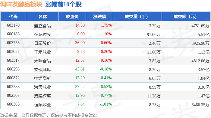 | 代码 | 名称 | 主力净流入(元) | 主力净占比 游资净流入 (元) | | 游资净占比 散户净流入 (元) | | 散户净占比 | | --- | --- | --- | --- | --- | --- | --- | --- | | 600186 | 莲花控股 | 4462.52万 | 8.10% | -1711.08万 | -3.11% | -2751.45万 | -4.99% | | 603027 | 千禾味业 | 2209.31万 | 19.49% | -40.83万 | -0.36% | -2168.47万 | -19.13% | | 600298 | 安道酵母 | 1243.29万 | 3.48% | -515.31万 | -1.44% | -727.98万 | -2.04% | | 600872 中炬高新 | | 1170.41万 | 11.20% | -1758.87万 | -16.83% | 588.46万 | 5.63% | | 603755 日辰股份 | | 1026.66万 | 11.50% | 311.68万 | 3.49% | -1338.35万 | -14.99% | ...
