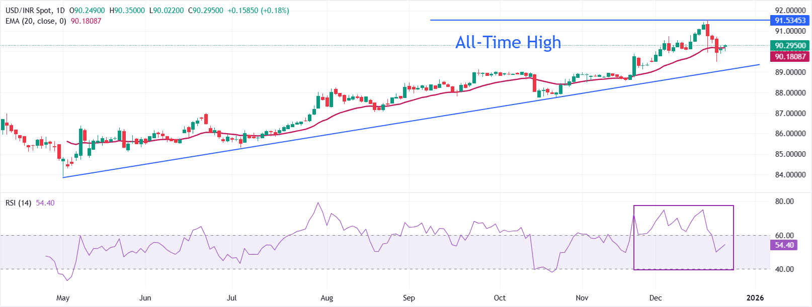 印度卢比对美元汇率近期出现波动。 周二交易中,美元/印度卢比汇率在触及三周低点89.25后反弹,主要受印度进口商在特定价位买入美元推动。 此前卢比上周显著回升,汇率曾跌至91.55附近的历史低点,随后印度储备银行通过在现货和非交割远期市场的干预操作支撑了本币。 数据显示,12月17日至19日期间,外国机构投资者转为净买家,在印度股市增持359.838亿卢比股份,为卢比提供短期支撑。但这一趋势未能持续,海外投 资者在周一转为净卖家,抛售45.734亿卢比股份,显示出资金流动的反复性。 外部环境方面,美元整体走势疲软 印度国内经济基本面显示积极信号。印度储备银行月度公报指出,11月经济增长保持坚挺,城乡需求强劲。报告强调"财政、货币与监管政策的协同作用"帮 助经济在全年度保持了韧性。 技术分析显示,美元/印度卢比汇率目前在90.2950附近交易。20日指数移动平均线位于90.1809,价格维持在均线上方,短期趋势偏积极。14日相对强弱指数 从超买区域回落至54的中性水平,表明上升动能有所缓和。关键支撑位位于89.1409附近,对应自83.8509形成的上升趋势线。若汇率持续维持在20日均线上 方,则回调空间有限; ...