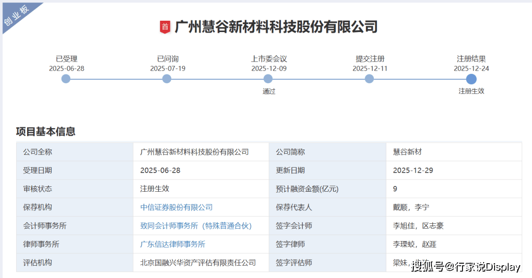 公司上市进程 - 广州慧谷新材料科技股份有限公司创业板IPO注册已生效 [1] - 公司IPO于2025年6月28日获得受理 同年7月19日进入问询阶段 [1] - 公司于2025年12月9日上会获得通过 并于12月11日提交注册 [1] 公司业务与募集资金用途 - 公司是一家专注于高分子材料领域 基于自主研发驱动的平台型功能性涂层材料企业 [1] - 公司拟募集资金约9亿元 [1] - 募集资金扣除发行费用后将用于清远慧谷新材料技术有限公司年产13万吨环保型涂料及树脂扩建项目 [1] - 募集资金还将用于清远慧谷新材料研发中心项目 慧谷新材生产线技术改造项目以及补充流动资金 [1]