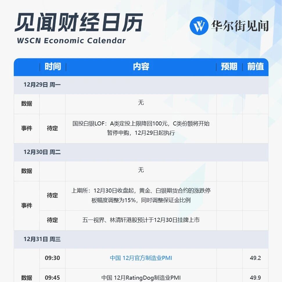 | 1月1日 周四 | | | | | | --- | --- | --- | --- | --- | | 数据 | | 元 | | | | 待定 | | 巴菲特正式卸任,阿贝尔将接任伯克希尔CEO | | | | 待定 | | 美国总统特朗普或将在1月第一周指定美联储新主席人选 | | | | 待定 | | 吉林化纤、湖南裕能、博汇纸业、亚太森博等核心产品涨 价 | | | | 事件 | 待定 | 《福建省促进两岸标准共通条例》1月1日起施行 | | | | 待定 | | 元旦假期, A股、港股、美股、英国、日韩休市, 中金所 广期所休市 | | | | 待定 | | 广期所:1月1日起,减免交割、期转现、仓单转让、仓单 作为保证金及套期保值手续费 | | | | 1月2日 周五 | | | | | | 数据 | 17:00 | 欧元区 12月制造业PMI终值 | 49.2 | 49.2 | | 22:45 | | 美国 12月标普全球制造业PMI | 51.8 | 51.8 | | 事件 | 待定 | 壁仍科技预计1月2日港股上市交易 | | | | 1月3日 周六 | | | | | | 数据 | | ...