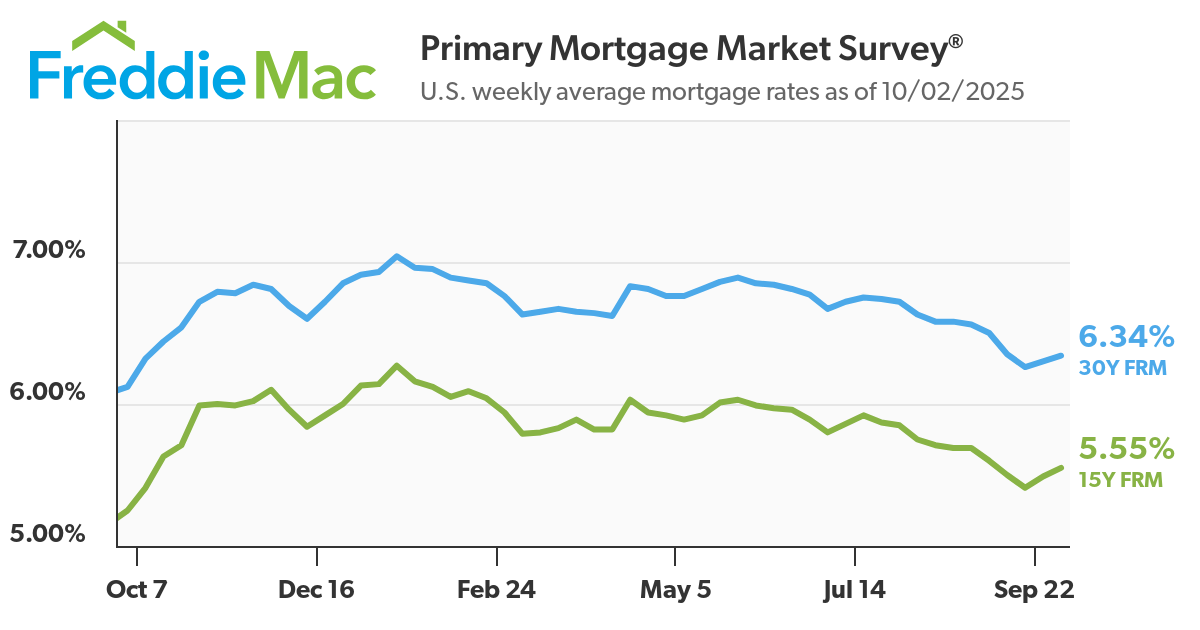 MCLEAN, Va., Oct. 02, 2025 (GLOBE NEWSWIRE) -- Freddie Mac (OTCQB: FMCC) today released the results of its Primary Mortgage Market Survey® (PMMS®), showing the 30-year fixed-rate mortgage (FRM) averaged 6.34%. “The 30-year fixed-rate mortgage increased again this week but remains below its 52-week average of 6.71%,” said Sam Khater, Freddie Mac’s Chief Economist. “The last few months have brought lower rates and as indicated by the recently reported increase in pending home sales, homebuyers are feeling mor ...