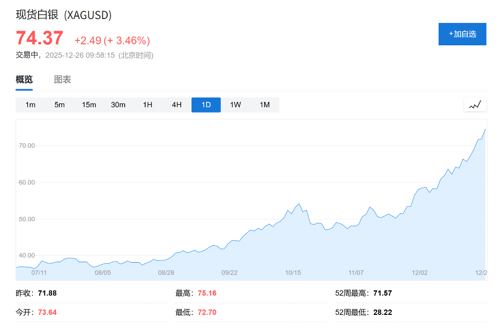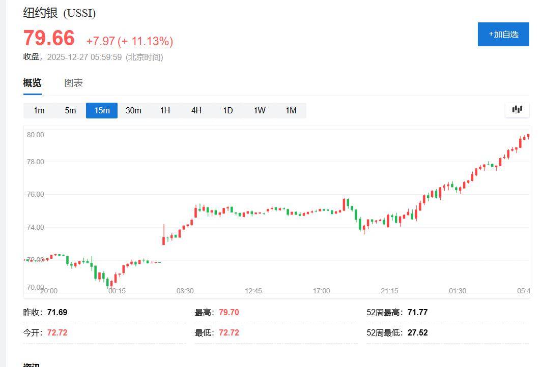 受益于地缘政治紧张局势加剧、美元走软以及圣诞节次日市场流动性不足,本周五金银齐创历史新高,白银首次逼近80美元/盎司,迅猛涨势远超黄 金。 白银在欧美交易时段持续上行,美股盘后,日内涨幅扩大10%以上,盘后创最高纪录时,现货白银涨至79.3136美元,日内涨近10.4%,纽约期银主力合 约3月合约涨至79.665美元,较前一交易日收盘涨11.1%。而纽约期金主力合约和现货黄金在美股早盘创盘中最高纪录时才分别涨1.8%和1.6%。 美股午盘时段期银收盘时,纽约期银即月合约已创三年多最大涨幅,COMEX 12月白银期货收涨7.68%,报76.486美元/盎司,不但收创最高纪录,而且 创2022年10月以来最大日涨幅。本周该即月合约累涨14.42%,2020年7月以来最大周涨幅,连涨五周。 截至本周五尾盘,现货白银徘徊79.30美元上下,日内涨约10.3%,今年以来累涨超170%,为同期黄金逾70%涨幅的两倍多。有评论称,周五金银创新高 的背景是中东、东欧、拉美等地的地缘政治风险高企,具体体现在比如,最近美国追截据称和委内瑞拉相关的油轮,美国对尼日利亚境内的伊斯兰国组 织发动军事打击。 不过,地缘风险只是部分推手, ...