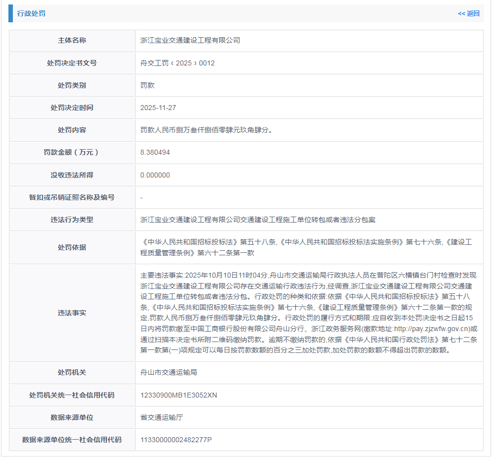 新闻热线电话0531-85193242 日前,信用浙江公示了浙江宝业交通建设工程有限公司的行政处罚决定。处罚决定书文号舟交工罚﹝2025﹞0012显示,2025年10月10日11时 04分,舟山市交通运输局行政执法人员在普陀区六横镇台门村检查时发现浙江宝业交通建设工程有限公司存在交通运输行政违法行为,经调查,浙 江宝业交通建设工程有限公司交通建设工程施工单位转包或者违法分包。依据《中华人民共和国招标投标法》第五十八条,《中华人民共和国 招标投标法实施条例》第七十六条,《建设工程质量管理条例》第六十二条第一款的规定,罚款人民币捌万叁仟捌佰零肆元玖角肆分。 公开信息显示,浙江宝业交通建设工程有限公司成立于2001年3月16日,注册资本22800万元,大股东是宝业集团股份有限公司。其官网显 示,宝业集团创建于1974年,2003年在香港联交所主板上市(02355.HK),主营建筑工业化研发制造、建筑施工(下辖3家施工总承包特级资质企 业)和绿色科技房产开发三大业务。 | 行政处罚 | << 返回 | | --- | --- | | 主体名称 | 浙江宝业交通建设工程有限公司 | | 处罚决定书文号 | 舟交工罚(2 ...