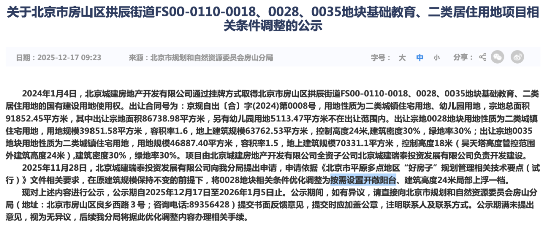 项目规划调整 - 房山区拱辰街道FS00-0110-0018、0028、0035地块项目于12月17日公示调整条件,其中0028地块优化调整为按需设置开敞阳台、建筑高度24米局部上浮一档[2][3] - 此次调整意味着北京城建颐知筑项目的东区(0028地块)将增设阳台,使其成为房山区首个在“好房子新规”后拥有阳台的新盘[3][5] - 项目西区(0035地块)已于今年3月25日取得预售证,其设计没有阳台,赠送面积主要为飘窗和设备平台[6][9] 项目销售与去化情况 - 颐知筑西区(0035地块)共19栋楼634套房源,目前网签89套,去化率仅为14%[7] - 项目成交均价为3.05万元/平方米,约为4.5万元/平方米销售指导价的68折[7][21] - 项目开盘时海报宣传首开热销162套,约为取证房源的三成不到,但后续8个月网签仅完成一半多转化,且成交均价始终低于指导价7折,一度达到66折[16] - 同板块兄弟项目和知筑(早半年入市)共576套房源已网签471套,去化率近八成,成交均价约3.72万元/平方米,表现显著优于颐知筑[16][18] 项目背景与竞争格局 - 颐知筑所在地块由北京城建于2024年1月4日以22.8亿元底价摘得,楼面价1.7万元/平方米,销售指导价4.5万元/平方米[11] - 项目开发主体为北京城建瑞泰投资发展有限公司,是北京城建集团的间接全资子公司[11] - 项目位于良乡大学城板块,总建筑面积13.82万平方米,规划34栋5-8层洋房共1206套房源,规模是和知筑项目的2倍多[18] - 项目离地铁站有段距离但靠近火车站,被认为其去化缓慢、价格承压的重要原因之一[16][18] - 项目周边3公里内竞争激烈,在售新盘包括华润京熙润府、京华国贤府、建工璟贤瑞庭等[20] - 北京城建新获取的广阳城地铁站地块出让文件明确鼓励按“好房子”标准设计,包括设置阳台,对颐知筑形成竞争压力[9][10] 产品与定价细节 - 西区19栋楼中,只有4栋位于小区中央的楼栋预售均价在4.6万元/平方米以上,私密性和景观视野更好[26] - 网签套数最多的4楼拟售均价为4.51万元/平方米,已签约的16套中有12套是单价更高的边户[22][23] - 去化率最高的是10楼,32套房源中已有13套网签,去化超四成,其拟售均价为4.61万元/平方米[25][26] - 楼王8楼预售均价4.66万元/平方米为全小区最高,次顶层边户单价达4.8万元/平方米,目前已有5套网签[28][29]