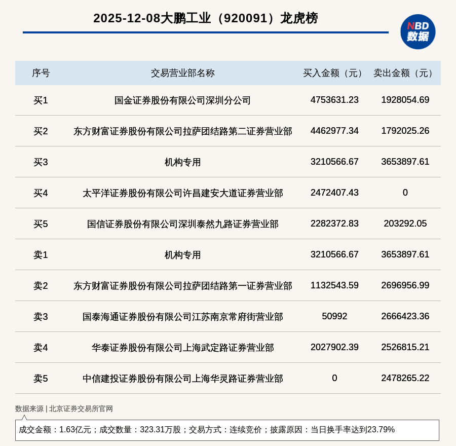 机构席位卖出365.39万 北交所上市公司大鹏工业登龙虎榜