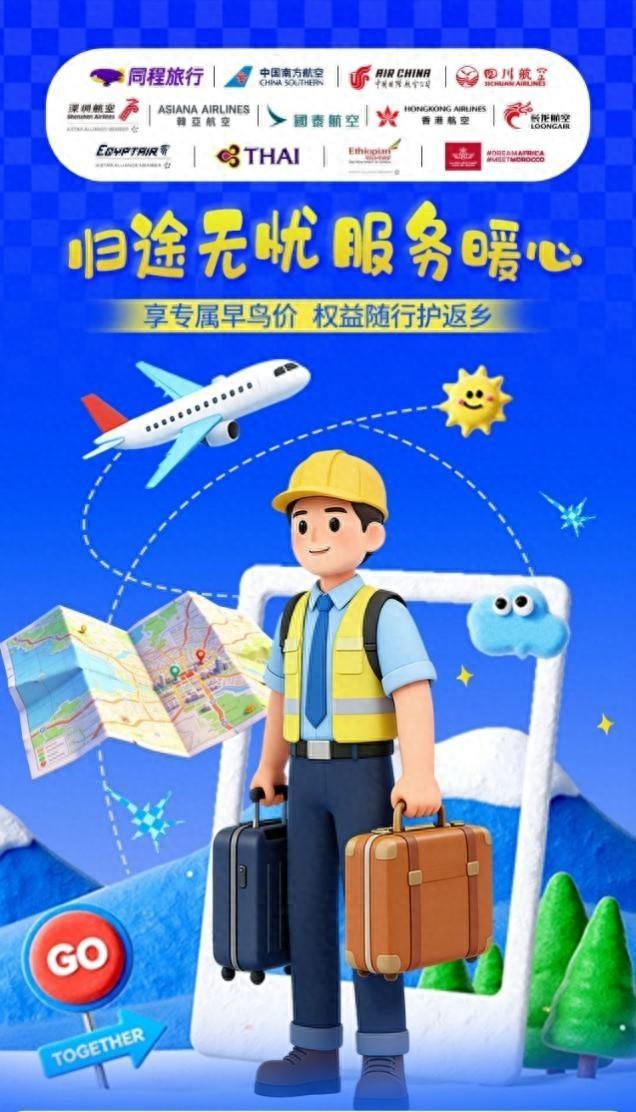 转自:北京日报客户端 岁末年尾,海外务工人群纷纷踏上返乡路,相关航线元旦及春节前后的机票预订迎来高峰。12月24日, 同程旅行宣布上线"归途无忧"活动,联合中国南方航空、四川航空、成都天府国际机场、越南机场集 团、中国国际航空等合作伙伴面向海外务工人员推出了机票"早鸟"优惠、机票酒店优惠券等,助力海外 务工人员年末顺利返乡。这是同程旅行首次举办面向海外务工群体的元旦春节返乡出行优惠活动。 同程旅行推出的"归途无忧"活动,在航线覆盖及权益内容方面充分考虑了海外务工人员比较集中的地 区,在资源选取等方面做了针对性规划。在活动内容方面,针对海外务工人员的机票提前订需求,提供 了机票预订"早鸟优惠",最高30元机票优惠券等;针对国际中转航班可能发生的旅途住宿及交通换乘需 求,活动提供了最高100元酒店优惠券以及金额不等的其他交通工具的票务优惠券等。海外务工人员可 通过同程旅行小程序和APP内的"归途无忧"专题了解活动详情。据了解,本次"归途无忧"活动联合了中 国南方航空、四川航空、中国国际航空、深圳航空、浙江长龙航空、国泰航空、香港航空、韩亚航空、 泰国国际航空、埃及航空、埃塞俄比亚航空、摩洛哥皇家航空等十余家国内外 ...