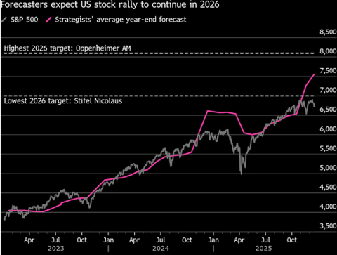 Seeking Alpha撰稿人、专业投资者Dividend Seeker预计美国大型股,尤其是标普500指数,将在2026年 初或年中出现10%或以上的回调;市场普遍看涨以及标普500指数相对于全球其他指数的估值偏高,都支 撑了其对美国股市持谨慎态度。不过,该分析师认为美国股市潜在的疲软是一个买入良机,并正在据此 调整其投资组合。此外,为了应对此次回调,该分析师倾向于投资英国和欧洲股票、黄金以及债券。 为什么美股将下跌? 原因一:华尔街都看好市场 第一个话题可能看起来有点反直觉,因为它关注的是市场分析师和预测者们的乐观程度。你可能会想, 这为什么是件"坏事",又为什么这会助涨回调预期呢?答案很简单:从众心理不可取,往往需要在市场 情绪狂热时选择逆向思维——犹如"别人贪婪我恐惧"。 情况并非总是如此,但在当前环境下,应该很容易理解这一点至关重要。考虑到美国股市下半年的强劲 表现,分析师们对2026年的预测如此自信,着实令人不安。数据显示,所有主要银行的分析师都预计明 年股市将上涨,部分预测甚至显示未来涨幅将相当强劲。 Dividend Seeker表示,让其持相反观点的并非仅仅是"人们认为市场会上涨",而是这 ...