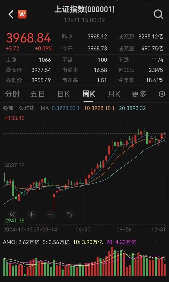 【导读】2025年最后一个交易日,白银又崩了! 来源:中国基金报 记者 泰勒 大家好,2025年的交易日,正式结束了。截至收盘,沪指今日涨0.09%,全年涨幅达18.41%,创下自 2019年以来最佳年度表现;深证成指今日跌0.58%,全年涨幅达29.87%,创下自2020年以来最佳年度表 现;创业板指今日跌1.23%,全年涨幅达49.57%,创下自2020年以来最佳年度表现;北证50指数今日跌 0.7%,全年涨幅达38.8%。 上证指数(000001) W 12-31 15:00:09 3968.84 昨收 3965.12 成交额 8295.12亿 3968.73 成交量 490.75亿 +3.72 今开 +0.09% 上涨 1066 平器 100 下跌 1174 最高价 市盈率 16.58 近20日 3977.54 2.34% 最低价 1.51 18.41% 市净率 3955.49 今年来 分时 日K 周K 月K 更多 ◎ 五日 叠加 设均线 MA 5:3923.03↑ 10:3928.15↑ 20:3893.32 4133.42 3537.38 2941.35 2024-12-13 25-03-14 0 ...