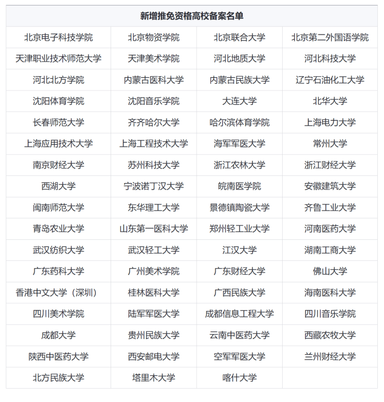 近日,教育部发布了《关于对新增推免资格高校予以备案的通知》,对全国67所新增推免资格高校予以备 案。其中,重庆共有2所高校入选,包括四川美术学院和陆军军医大学。 截至目前,重庆共10所高校具有推免资格,分别是:重庆大学、西南大学、西南政法大学、重庆医科大 学、重庆邮电大学、重庆交通大学、四川外国语大学、重庆师范大学、陆军军医大学、四川美术学院。 推免,俗称保研,全称"推荐优秀应届本科毕业生免试攻读硕士学位研究生"。其中,"免试"是指普通高校 应届本科毕业生不必经过全国硕士研究生入学统一考试的初试,直接进入复试。 | | 新增推免资格高校备案名单 | | | | --- | --- | --- | --- | | 北京电子科技学院 | 北京物资学院 | 北京联合大学 | 北京第二外国语学院 | | 天津职业技术师范大学 | 天津美术学院 | 河北地质大学 | 河北科技大学 | | 河北北方学院 | 内蒙古医科大学 | 内蒙古民族大学 | 辽宁石油化工大学 | | 沈阳体育学院 | 沈阳音乐学院 | 大连大学 | 北华大学 | | 长春师范大学 | 齐齐哈尔大学 | 哈尔滨体育学院 | 上海电力大学 | | 上海 ...