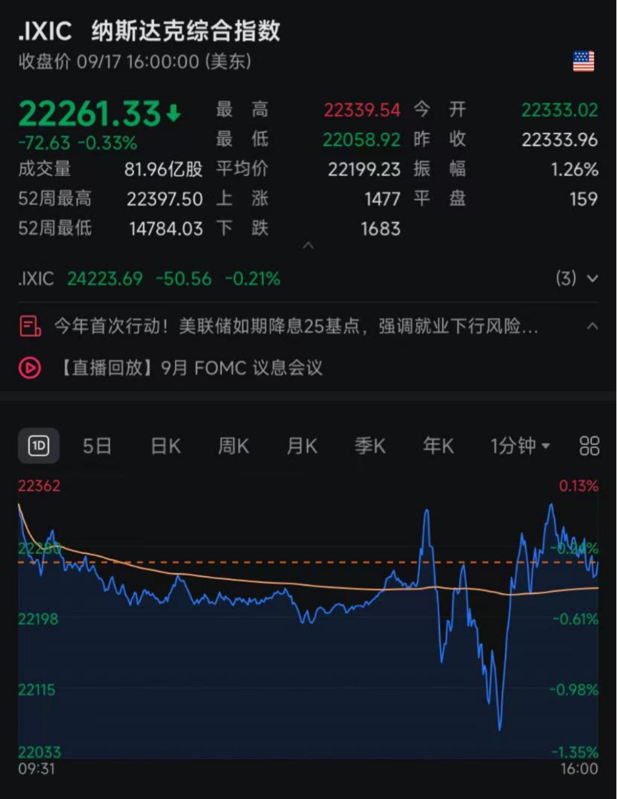 不过,美联储主席鲍威尔在随后的新闻发布会上称,此次的降息举措是一项风险管理决策,没有必要快速调整利率。这意味着美联储并不会进入持续性的 降息周期,市场情绪因此降温,纳指盘中一度跌逾1%。截至收盘,道指涨0.57%,标普500指数跌0.1%,纳指跌0.33%。 盘面上,美股大型科技股表现分化,特斯拉涨超1%,英伟达跌逾2%,亚马逊跌超1%。而热门中概股多数上涨,纳斯达克中国金龙指数大涨2.85%。 美联储如期降息25基点 美股主要指数涨跌不一 北京时间9月18日凌晨,美国联邦储备委员会在结束为期两天的货币政策会议后宣布,将联邦基金利率目标区间下调25个基点到4.00%至4.25%之间,符合 市场预期。这也是美联储自去年12月以来,时隔9个月的再度降息。 本次会议的降息决定完全在投资者意料之中。本周二收盘时,芝商所(CME)的"美联储观察"工具显示,期货市场预计美联储本周降息25个基点的概率 约为96%,10月下次会议继续降息的概率约为80%,12月进一步降息的概率接近74%。 美联储宣布降息之后,市场反应剧烈。美股三大指数一度直线拉升,随后跳水。鲍威尔在随后的新闻发布会上称,今天的降息举措是一项风险管理决策, ...