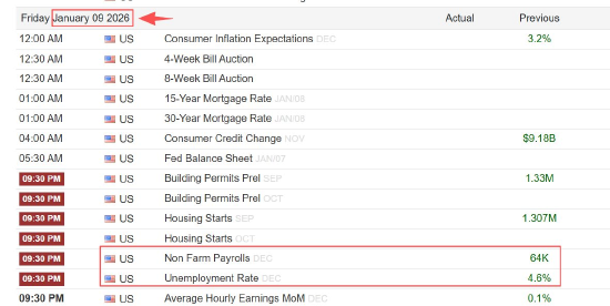 专题:ATFX外汇专栏投稿 12月29日,ATFX前瞻:本周是衔接12月与1月的过度周。正常状态下,本周五美国劳工统计局将公布美 国的非农就业报告。因为美国政府在10~11月的停摆,导致美国劳工统计局的数据发布系统性延迟。12 月份的非农就业报告从本周五延迟至下周五,也就是2026年1月9日21:30。所以,本周五没有非农就业 报告,美元及金银的波动性可能相较传统非农周偏弱。 ▲ATFX图 | Friday January 09 2026 | | | Actual Previous | | --- | --- | --- | --- | | 12:00 AM | SO US | Consumer Inflation Expectations DEC | 3.2% | | 12:30 AM | SO US | 4-Week Bill Auction | | | 12:30 AM | SO US | 8-Week Bill Auction | | | 01:00 AM | SO US | 15-Year Mortgage Rate JAN/08 | | | 01:00 AM | SO US | 30-Year M ...