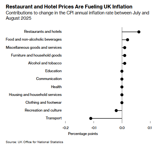 尽管波动性较大的航空票价有所下降,但燃油价格、餐饮及酒店价格的上涨抵消了这一影响。食品通胀 率持续攀升至4.8%,创下2024年初以来的最高水平;服务业通胀率虽降至4.7%,但仍高于英国央行可接 受的范围。 智通财经APP获悉,8月,英国通胀率维持在逾一年半以来的最高水平,这一令人担忧的数据可能会让 英国央行官员对进一步降息保持谨慎态度。 英国国家统计局周三发布数据显示,8月消费者价格指数(CPI)同比上涨3.8%,与7月涨幅持平,这一涨 幅与英国央行及私营部门经济学家的预测一致。 摩根大通资产管理公司全球市场分析师Zara Nokes表示:"英国当前的通胀形势愈发严峻,遗憾的是, 在情况好转之前,可能还会进一步恶化。本周英国央行几乎肯定不会降息,即便放眼全年,除非劳动力 市场出现更显著的恶化,否则再次降息的可能性也正变得越来越小。" 受暑期出行时间因素影响,7月英国航空票价一度创下30%的环比涨幅;而8月航空票价环比仅上涨 2.1%。由于去年8月航空票价上涨22%,今年同期数据实际上对通胀产生了下拉作用。 英国国家统计局首席经济学家Grant Fitzner指出,燃油价格的小幅上涨以及住宿成本降幅低于去年同 ...