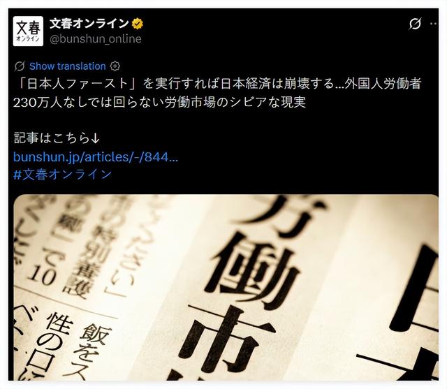 文章核心观点 - 日本经济高度依赖外籍劳工 若推行“日本人优先”政策驱逐外籍劳工 日本劳动力市场将无法运转 经济将崩溃[1][5] - 日本外籍劳工数量已突破230万人 创下历史新高[1] 日本外籍劳工现状与制度问题 - 日本外籍劳工数量截至2024年10月底已突破230万人 创历史新高[1] - 外籍劳工年龄集中在20-30岁 已成为制造业和住宿餐饮业一线青年员工岗位的常态化主力[5] - 日本“技能实习生”制度申请门槛低 申请者多属非熟练劳动力 薪资水平被压低[2] - 该制度对实习生在更换单位、变更住所等方面施加诸多流动限制 导致部分人面临困难甚至“潜逃”[2] 外籍劳工对日本经济与产业的具体支撑 - “技能实习生”制度维系着日本地方产业的生存 保障了日本民众的生活水平[5] - 在农村、偏远渔村和山区等难以吸引本地劳工的地区 农产品供应完全依赖该制度带来的外籍劳工[5] - 在食堂后厨、连锁餐饮和预制菜生产车间等岗位 情况同样如此[5] - 若赶走外籍劳工或废除该制度 相关领域从业者将破产倒闭 日本的蔬菜、水产品等农产品价格以及预制菜和在外就餐价格将大幅上涨[5] 政治舆论与经济现实的矛盾 - 日本右翼民粹势力提出“日本人优先”和“限制外国人”口号 将外籍劳工作为情绪靶子[1][2] - 日本的经济稳定是通过限制外籍劳工权利来实现的[6] - 决策者不应简单迎合右翼民粹情绪 而需拿出清晰明确的规划[5]