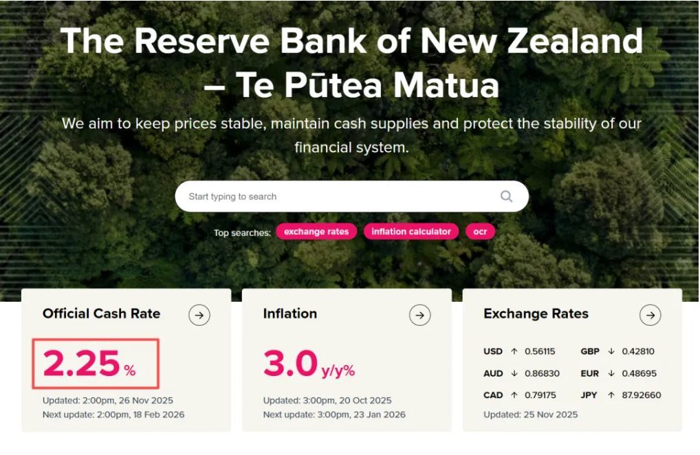 在声明中,委员会提到,9月季度消费者年度物价通胀率上升至3%,为货币政策委员会1%至3%目标区间的最高点。经济中仍有大量备用产能, 预计到2026年中期通胀率将降至约2%。自2024年8月以来,OCR的大幅下降预计将支持经济活动的复苏。 委员会指出,核心通胀和不可交易通胀均持续下降。由于汽油价格和食品通胀高企,9月年度可贸易商品通胀上升,但中期内预计将有所下降。 由于可交易商品通胀上升,加上家庭能源成本和地方议会税率的高通胀,年度总体CPI通胀上升。随着这些波动消散,预计整体CPI通胀将在2026 年中期回落至目标区间的2%左右。 新西兰的降息步伐仍在继续。 11月26日,新西兰联储宣布将官方现金利率(OCR)下调25个基点至2.25%。 这一决定符合市场普遍预期,在受访的36位分析师中,有32位此前已预测此次降息。 声明显示,委员会讨论了将OCR维持在2.5%和降低至2.25%两个选项。最终,委员会以5:1的投票,决定将OCR下调25个基点。委员会指出,降 低OCR有助于支撑消费者和企业信心,并抵消经济复苏速度比达到通胀目标所需的更慢的风险。OCR未来的走向将取决于中期通胀和经济的前景 变化。 | 0.56 ...