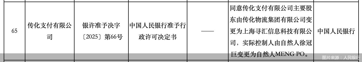 北京商报讯(记者 岳品瑜 董晗萱)一笔买方来自跨境支付机构的支付牌照交易获批。8月18日,北京商报记者注意到,人民银行官网更新了非银行支付机构 重大事项变更许可信息,同意传化支付有限公司(以下简称"传化支付")主要股东由传化物流集团有限公司变更为上海寻汇信息科技有限公司(以下简 称"上海寻汇")。 | | | | | 同意传化支付有限公司 东由传化物流集团有限 | | --- | --- | --- | --- | --- | | | 传化支付有限公 | 银许准予决字 | 中国人民银行准予行 | | | 65 | 可 | 〔2025〕 第66号 | 政许可决定书 | 更为上海寻汇信息科技 | | | | | | 司,实际控制人由自然 | | | | | | 巨变更为自然人MEN | 上海寻汇是跨境支付品牌寻汇SUNRATE(以下简称"寻汇")在中国境内的运营主体,后者全球业务总部位于新加坡,目前已在香港、雅加达、东京、伦敦 和上海等地设有办事处。其对于传化支付的收购事项于今年4月开始,根据公告,上海寻汇以3.15亿元的价格拿下了这张支付牌照。 正如公司自身评价,跨境支付服务商持续谋求支付牌照,一方面是基于国内 ...