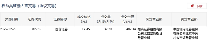 | 交易日期 | 证券代码 | 证券简称 | 成交价格 | 成交量 | 成交金额 | 买方营业部 | 卖方营业部 | | --- | --- | --- | --- | --- | --- | --- | --- | | | | | (元) | (万股/万份) | (万元) | | | | 2025-12-29 | 002736 | 国信证券 | 12.45 | 32.30 | 402.14 招商证券股份有限 | | 中国银河证券股份 | | | | | | | | 公司北京景辉街证 | 有限公司北京中关 | | | | | | | 券营业部 | | 村大街证券营业部 | 12月29日,国信证券大宗交易成交32.3万股,成交额402.14万元,占当日总成交额的1.44%,成交价 12.45元,较市场收盘价13.13元折价5.18%。 ...