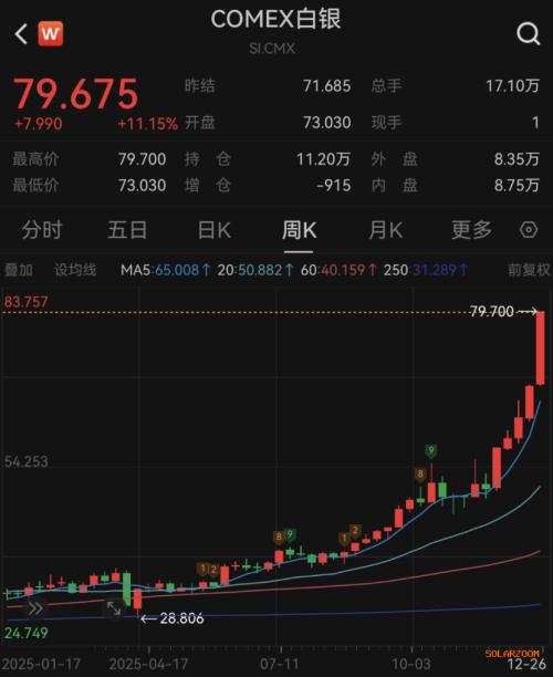 "涨到人头晕目眩"! 本周,白银价格上演史诗级暴涨,COMEX白银期货周五暴涨超11%,现货白银暴涨超10%,再创历史 新高,年内累计涨幅达175%,迅猛涨势远超黄金。对此,特斯拉CEO马斯克表达了担忧,直言这对工 业发展"不是好事"。 有分析指出,受全球结构性赤字、库存暴跌及纸面交易脱节影响,白银正面临供应挤压。由于在光伏与 电动车领域不可替代,白银供应瓶颈正对现代工业链造成严峻挑战。 马斯克重大警告 美东时间12月26日,COMEX白银期货暴涨11.15%,报79.68美元/盎司,本周累涨18.06%;现货白银暴涨 10.24%,报79.196美元/盎司,本周累涨17.87%。 当地时间12月27日,马斯克在社交媒体平台X上发表评论称:"这不好。白银在许多工业过程中是被需 要的。" 马斯克的担忧主要源于白银在现代工业中的核心地位。与黄金不同,白银不仅仅是避险资产,更是工业 金属,其在太阳能电池板、电动汽车、电子产品及医疗设备中都具有不可替代的作用。 目前工业需求在白银总需求中的占比已攀升至50%至60%,因此白银价格的疯涨正在加剧实体制造商的 焦虑。 白银市场的供需裂痕正在扩大。2025年的数据显示,全球 ...