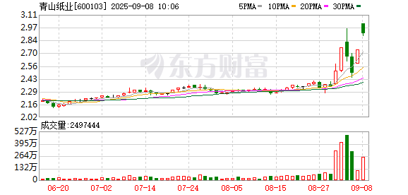 股价表现 - 青山纸业在5个交易日内录得3个涨停 累计涨幅达19.92%[2] - 累计换手率为60.47% 最新单日成交量为1369.51万股 成交金额4122.23万元[2] - 主力资金净流入呈现大幅波动 单日最高净流入13252.12万元(9月5日) 最低净流出14671.31万元(9月3日)[2] 市值与交易数据 - 最新A股总市值达67.45亿元 A股流通市值66.59亿元[2] - 因日涨幅偏离值达7%上榜龙虎榜1次 沪股通累计净买入908.87万元[2] - 营业部席位合计净买入8516.61万元[2] 财务业绩 - 上半年营业总收入12.10亿元 同比下降15.27%[2] - 上半年实现净利润0.56亿元 同比增长1.74%[2]