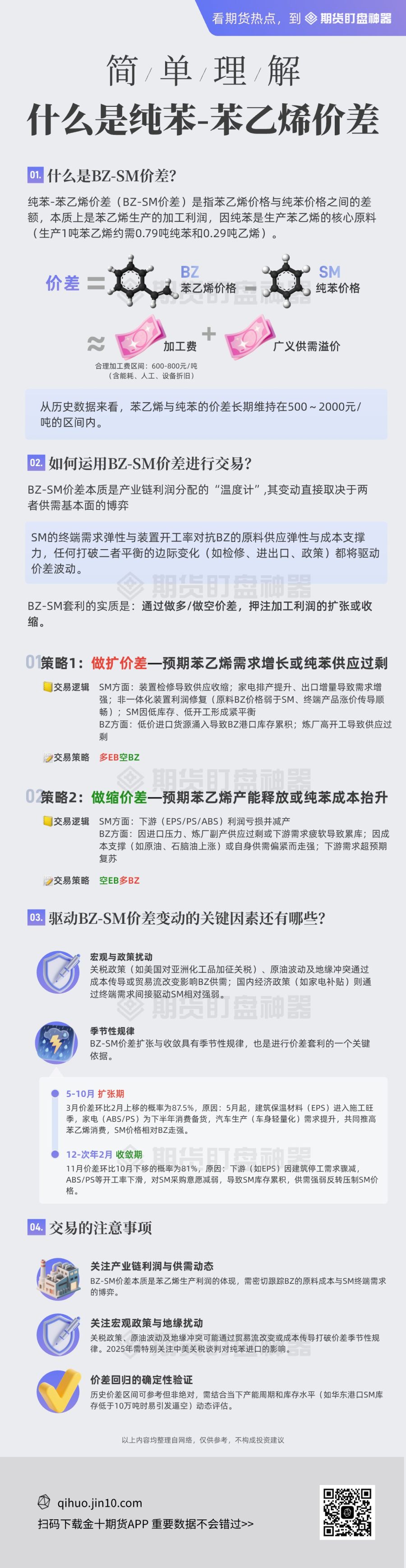 金十期货热图 纯苯-苯乙烯价差是指苯乙烯价格与纯苯价格之间的差额,本质上是苯乙烯生产的加工利润,该如何运用BZ-SM价差进行交易? 一图了解。 0 策略2:做缩价差—预期苯乙烯产能释放或纯苯成本抬升 价差波动。 BZ-SM套利的实质是:通过做多/做空价差,押注加工利润的扩张或收 缩。 0 〔策略1:做扩价差—预期苯乙烯需求增长或纯苯供应过剩 03. 驱动BZ-SM价差变动的关键因素还有哪些? 宏观与政策扰动 关税政策(如美国对亚洲化工品加征关税)、原油波动及地缘冲突通过 成本传导或贸易流改变影响BZ供需;国内经济政策(如家电补贴)则通 过终端需求间接驱动SM相对强弱。 季节性规律 BZ-SM价差扩张与收敛具有季节性规律,也是进行价差套利的一个关键 依据。 5-10月 扩张期 3月价差环比2月上移的概率为87.5%,原因:5月起,建筑保温材料(EPS)进入施工旺 季,家电(ABS/PS)为下半年消费备货,汽车生产(车身轻量化)需求提升,共同推高 苯乙烯消费,SM价格相对BZ走强。 190 F. SM方面:装置检修导致供应收缩;家电排产提升、出口增量导致需求增 |交易逻辑 强;非一体化装置利润修复(原料BZ价格弱 ...