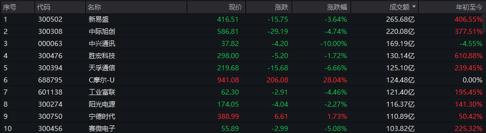 半导体设备概念局部走强,亚翔集成涨停续创历史新高。摩尔线程涨超28%收941.08元,总市值超4400亿元。 下跌方面,福建方向多股走弱,中国武夷、舒华体育跌停。 沪深两市成交额1.86万亿元,较上一个交易日放量786亿。 市场震荡调整,沪指高开低走,创业板指冲高回落,此前一度涨超1%。全市场近4400只个股下跌。截至收盘,沪指跌0.7%,深成指跌 1.27%,创业板指跌1.41%。 从板块来看,商业航天概念逆势走强,再升科技4连板,四川金顶、华菱线缆等10余股涨停。 零售概念局部活跃,百大集团快速涨停,东百集团5连板。 个股方面,新易盛成交额265.68亿元居首,中际旭创、中兴通讯、胜宏科技等成交额考前。 | 序号 | 代码 | 名称 | 现价 | 涨跌 | 涨跌幅 | 成交额▼ | 年初至今 | | --- | --- | --- | --- | --- | --- | --- | --- | | 1 | 300502 | 新易盛 | 416.51 | -15.75 | -3.64% | 265.68 Z | 406.55% | | 2 | 300308 | 中际旭创 | 586.81 | -29.19 ...