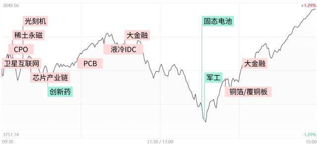 市场表现 - 三大指数全线收红,沪指涨1.14%,深成指涨2.25%,创业板指涨3.82%,科创50指数涨超7% [1] - 沪深两市全天成交额2.97万亿元,较上个交易日缩量1948亿元 [1] - 全市场超2800只个股上涨,市场热点集中在算力和芯片方向 [1] 算力硬件板块 - CPO等算力硬件股维持强势,天孚通信、长飞光纤、沃格光电涨停,东田微、德科立、生益电子、中际旭创、鹏鼎控股等个股涨幅居前 [2] - 英伟达2026财年Q2营收467.4亿美元,同比增长56%,净利润264.2亿美元,同比增长59% [2] - 机构研报表示CPO概念持续走强是AI算力需求爆发与技术迭代共振的必然结果,行业处于"技术验证完成→规模商用启动"的关键节点 [2] - 资金炒作向液冷、数据中心、光纤、铜缆等产业链全面延伸 [2] 半导体芯片板块 - 芯片股集体大涨,博通集成、瑞芯微、斯达半导、大港股份等个股涨停,寒武纪、中芯国际、复旦微电、东芯股份、上海新阳等个股涨超10% [3] - 寒武纪涨超15%报收1587.91元,股价超越贵州茅台,中芯国际涨超17%创历史新高 [6] - 政策层面国务院印发《关于深入实施"人工智能+"行动的意见》,支持人工智能芯片攻坚创新与软件生态培育 [3] - 全球AI算力需求持续攀升推动先进制程芯片需求,科创50指数以历史最大成交额完成向上反包 [3] 个股表现 - CPO概念股天孚通信、中际旭创、新易盛、胜宏科技、沪电股份、生益电子等核心标的续创新高 [5] - 中报业绩显示上述个股维持高速增长态势,行业整体高景气度 [6] - 资金向后排标的扩散,则成电子、奕东电子、鼎通科技等个股涨停 [6] - 电子方向成交额占比达40%左右,需警惕交易结构恶化风险 [6] 涨停梯队 - 5板:天普股份 [7] - 3板:启明信息、德创环保、国光连锁 [7] - 2板:农产品、云南城投、岩山科技、隆扬电子、豪恩汽电、博通集成、济民健康、瑞芯微、建业股份 [7] 后市展望 - 市场再现V型反弹,彰显强劲承接动能,后续关注量能能否维持2.8万亿元以上水平 [8] - AI产业链主导的科技行情尚不可轻易言顶,但需警惕情绪过热导致波动加剧 [8] 政策与宏观 - 商务部推动离境退税政策落实,上半年离境退税商店数量成倍增加,退税消费额同比增长95% [10] - 截至2025年7月末,全国地方政府债务余额52.76万亿元,其中一般债务17.25万亿元,专项债务35.51万亿元 [11]