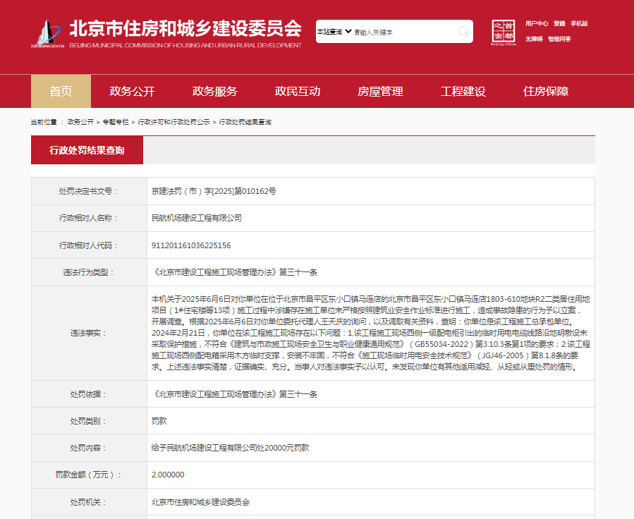 齐鲁晚报·齐鲁壹点记者于北京市住房和城乡建设委员会(下称"北京住建委")官网获悉,7月15日,民航机场建设工程有限公司(下称"民航建工")因施工 现场存在事故隐患收到罚单,行政处罚决定书文号为京建法罚(市)字[2025]第010162号。 | | 主房和城乡建设计 MUNICIPAL COMMISSION OF HOUSING AND URBAN RURAL DEVELOPMEN | | 材素米人名都 > 原因为 | | | | --- | --- | --- | --- | --- | --- | | 首页 | | 政务公开 政务服务 政民互动 房屋管理 | | 工程建设 | 住房保障 | | 当前位置:政务公开 > 专题专栏 > 行政许可和行政处罚公示 > 行政处罚结果查询 | | | | | | | 行政处罚结果查询 | | | | | | | 处罚决定书文号: | | 京建法罚(市)字[2025]第010162号 | | | | | 行政相对人名称: | | 民航机场建设工程有限公司 | | | | | 行政相对人代码: | | 911201161036225156 | | | | | 违法行为类型: ...