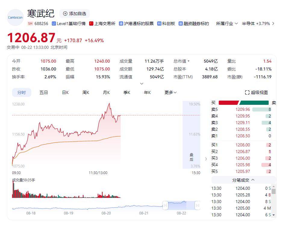 寒武纪股价触及1238元 超越中芯国际成科创板市值第一股