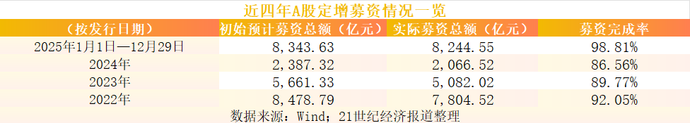 记者丨崔文静 实习生 张长荣 编辑丨张星 A股定增市场正迎来爆发式复苏! Wind数据显示,截至12月29日(下同),2025年已有155家上市公司通过定向增发募资8244.55亿元,较2024年全年2066.52亿元的规模猛增近 四倍,甚至超过2022年的7804.52亿元。这一跃升不仅终结了2023年"827新政"后融资低迷的困局,更成为市场信心回暖的鲜明信号。 多重利好共同推动热潮:自2024年9月A股持续企稳,股市承载力显著提升,定增发行难度降低;再融资政策同步转向宽松,交易所审核提 速;加之此前积压的融资需求集中释放,企业纷纷抓住窗口期推进项目。 更亮眼的是募资完成率——2025年定增完成率达98.81%,较2024年大幅改善12.25个百分点。凸显市场对优质项目的强劲承接力。 券商承销格局也随之洗牌。2025年券商定增承销总额飙升至7168.90亿元,是2024年的5倍以上。中信证券以1885.63亿元稳居榜首;国泰海通、 中银证券分列二、三位。不过,承销金额虽暴涨,行业总收入仅微增0.17亿元至10.50亿元,反映竞争白热化。 | 近四年A股定增募资情况一览 | | | | | --- | -- ...