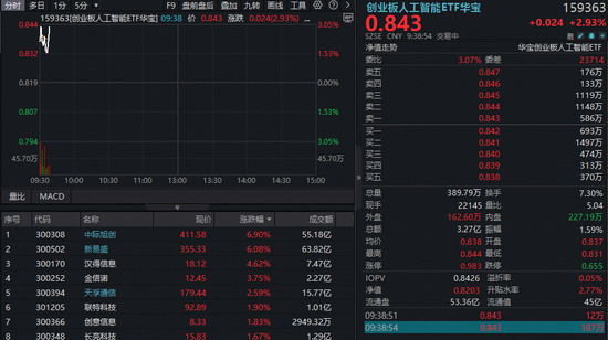 周三(9月10日),AI主线卷土重来,光模块等算力硬件再次引爆,叠加AI应用活跃,创业板人工智能 强势反弹逾3.5%。成份股大面积飘红,协创数据大涨超11%创历史新高,中际旭创、新易盛携手大涨超 6%,光库科技、天孚通信、太辰光等多股跟涨超3%。 热门ETF方面,同标的指数规模最大、流动性突出的创业板人工智能ETF(159363)全天强势,场内价 格一度摸高5.57%,收盘仍大涨3.67%收复10日线。全天成交额达15.79亿元,居全市场AI主题类ETF首 位。资金面上,159363近20日累计吸金超20亿元。 数据来源:沪深交易所等。注:"全市场首只"是指首只跟踪创业板人工智能指数的ETF。 风险提示:创业板人工智能ETF华宝被动跟踪创业板人工智能指数,该指数基日为2018.12.28,发布日 期为2024.7.11。创业板人工智能指数2020-2024年年度涨跌幅分别为:20.1%、17.57%、-34.52%、 47.83%、38.44%,指数成份股构成根据该指数编制规则适时调整,其回测历史业绩不预示指数未来表 现。文中指数成份股仅作展示,个股描述不作为任何形式的投资建议,也不代表管理人旗下任何基金的 ...