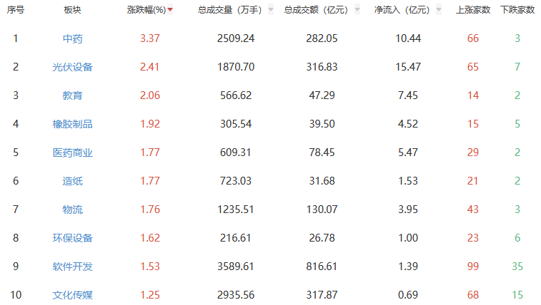 A股市场板块涨跌幅排行 | 序号 | 板块 | 涨跌幅(%)▼ | 总成交量(万手)▼ | 总成交额(亿元) ▼ | 净流入(亿元) ▼ | 上涨家数 | NEF STORES | | --- | --- | --- | --- | --- | --- | --- | --- | | 1 | 中药 | 3.37 | 2509.24 | 282.05 | 10.44 | ୧୧ | 3 | | 2 | 光伏设备 | 2.41 | 1870.70 | 316.83 | 15.47 | રે | 7 | | 3 | 教育 | 2.06 | 566.62 | 47.29 | 7.45 | 14 | 2 | | র্ব | 橡胶制品 | 1.92 | 305.54 | 39.50 | 4.52 | 15 | 5 | | 5 | 医药商业 | 1.77 | 609.31 | 78.45 | 5.47 | 29 | 2 | | 6 | 造纸 | 1.77 | 723.03 | 31.68 | 1.53 | 21 | 2 | | 7 | 物流 | 1.76 | 1235.51 | 130.07 | 3.95 | 43 | ട് ...