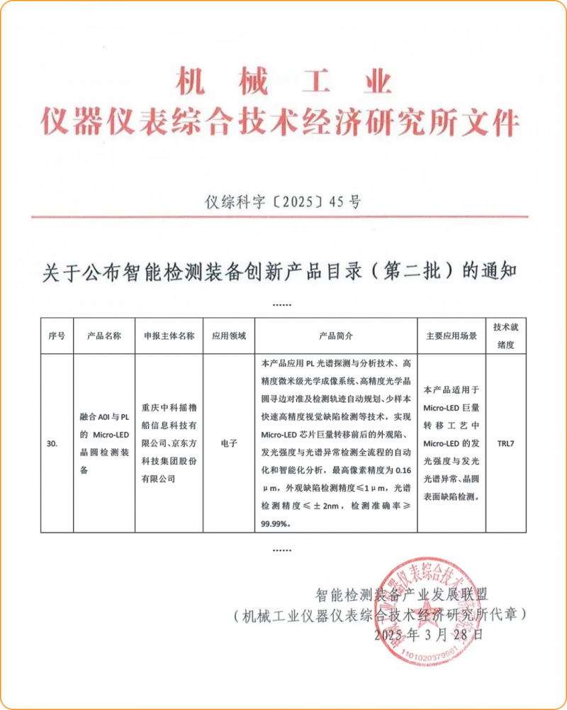一块指甲盖大小的Micro-LED晶圆上,密布着数百万颗发光芯片。如何用"火眼金睛"检测出微米级缺陷?这道困扰 半导体显示行业的难题,如今被摇橹船科技研发团队攻克。 《智能检测装备创新产品目录》 由工业和信息化部组织实施,旨在遴选具有自主知识产权、技术先进、市场前景广阔的智能检测装备产品。该目 录重点聚焦制造业转型升级需求,通过树立行业标杆,引导产业创新发展方向。入选产品需经过严格评审,代表 国内智能检测领域最高技术水平。 | 序号 | 产品名称 | 申报主体名称 | 应用领域 | 产品简介 | 主要应用场景 | 技术就 绪度 | | --- | --- | --- | --- | --- | --- | --- | | 30. | 融合 AOI 与 PL 的 Micro-LED | 重庆中科摇撸 限公司、京东方 | 电子 | 本产品应用 PL 光谱探测与分析技术、高 精度微米级光学成像系统、高精度光学晶 | 本产品适用于 Micro-LED 巨量 Micro-LED 的发 | TRL7 | | | | | | 圆寻边对准及检测轨迹自动规划、少样本 | | | | | | | | 快速高精度视觉缺陷检测等技术 ...