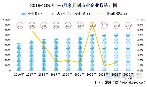 2025年1-5月家具制造业企业有7421个,同比增长1.24%